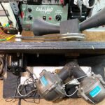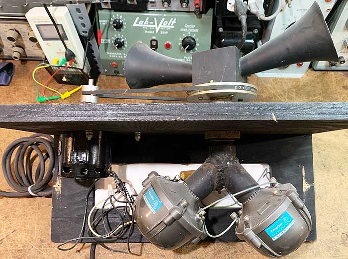 The horn driver is a pair of standard Fanon DU60, 60 watt, 16 ohm units, wired in parallel to be able to sink up to 120 watts at 8 ohms. The sound tube from the drivers to the horn is constructed of standard iron gas piping and fittings, and the motor is a common motor used for ventilating fans typically.